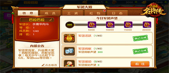 【军团大殿】:可查看军团成员信息、发放和领取军团红包、查看军团成员活跃度和军团日志、退出军团。