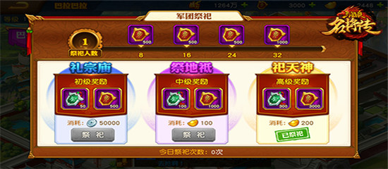 【军团祭祀】:每日祭祀、领取祭祀宝箱奖励。