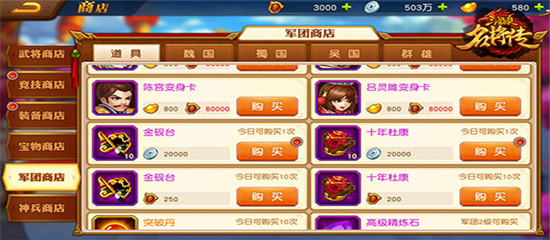 【军团商店】:使用军团贡献兑换道具和武将碎片。