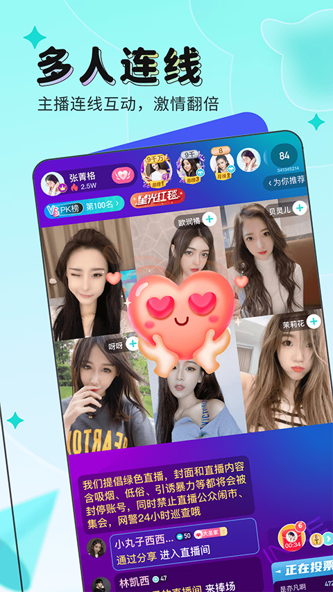 1、高颜值主播云集,在这里你可以尽情的进行交友,发挥你的长处,吸引更多的粉丝。2、涵盖了多种类型的直播内容,包括娱乐、生活、体育、游戏等,满足了不同用户的需求。