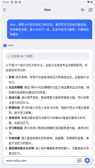 1、智能搜索Kimi智能助手支持搜索实时信息,迅速整合,给出详尽回答,并提供搜集到的信息来源,让对话兼具丰富性和准确性。
