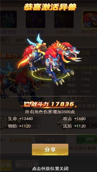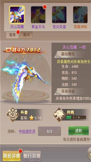 异兽可以通过升星和升阶来获得属性的提升,升星需要消耗材料升星石(可通过新增的材料副本-升星石副本获得),进阶可以提高异兽升星的上限。异兽进阶需要消耗与异兽同品质的进阶丹,进阶丹可以通过商城购买或者使用升星石炼制得到。这两者属性的提高,都能为玩家大大增加战力。