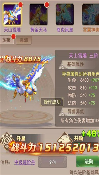 在现阶段,已经开放的8只异兽,都是能相对简单地获得的。其中蓬莱最顶级的异兽“雪翼神驹”现在正低折抢购中。而另外三只异兽,则在通关修仙之路20、200以及800层后获得,已经通关的仙友需要进入界面噢,左方会有免费领取的窗口闪动,点击即可。这四只来自蓬莱的异兽是非常容易获得的,一旦集齐,即可开启“异兽共鸣”效果,可增加大量属性,或一个特殊技能效果。