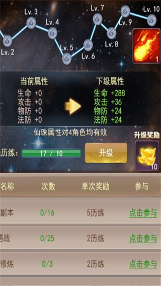 历练玩法中的仙珠,提升仙珠等级不仅可以有属性上的提升和技能提升,还会获得额外的元宝奖励。只需要每天完成任务就可以获取元宝,何乐而不为呢。为了快速地升级,记得每个任务都要做哦。别再说你不知道玩什么了,看看仙珠界面就知道了。