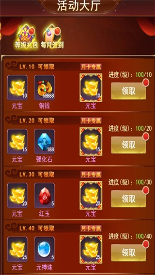 进入游戏升级即可领取升级礼包中的元宝,级别越高元宝越多。这是一个升级超快的游戏,所以一百级礼包都是随随便便就能拿到的。升级非常轻松,到时候直接领取元宝就好了。