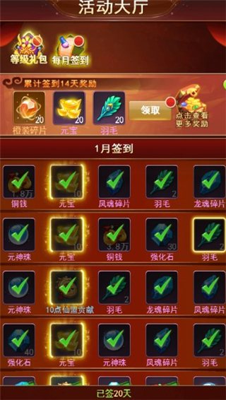每上线点一下,指定天数就会有元宝赠送。另外累积达到一定天数还有不同数额的元宝哦。这些元宝都是只要玩就能拿到的,千万不要浪费。