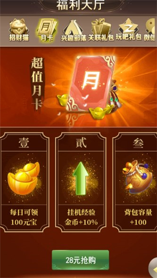 介绍了很多不花钱的,但是总有小伙伴抑制不住花钱欲望。给大家推荐一个月卡消费,只要28元,每天可以领取100元宝,还有经验金币加成。28块钱可以领取3000元宝真的是非常划算啊。并且月卡还可以多领取一次等级礼包的元宝,也算是额外福利了。