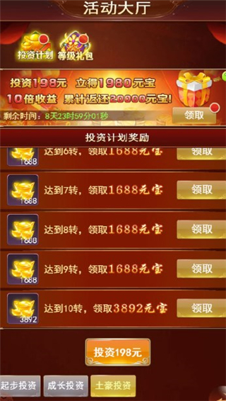 可以理解为是加强版的土豪等级礼包,花费少量的钱,后续可以在不同等级领取大量的元宝。返利比差不多达到了10倍,非常的划算。如果你有点小钱建议你购买这个投资计划。