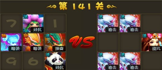 2号振奋最先出手,然后3号和7号就变成靶子让对面打,而4号夺魂就控制住了对面的4号,让它出不了手,这样的阵型是7号位的顽抗被打一下,完胜过关,也许有人会问,那为什么7号顽抗不放4号位呢?道理很简单,因为对面的3号是暗袭,暗袭有怒气了,它的攻击顺序是先打自己对位的最后一个,所以它会打9号再打78,如果放4号位置后排一个都没有,那么它会直接秒你的输出6号了。