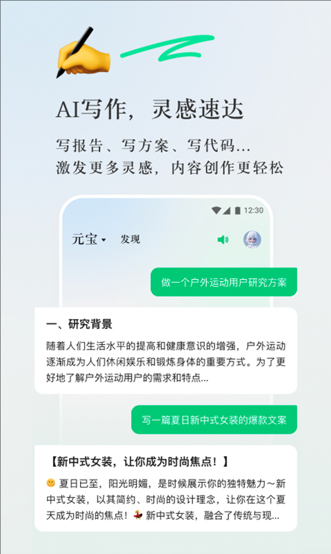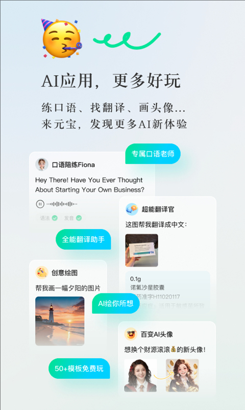 同时,在腾讯元宝AI官方版中元宝还具有非常强大的语言理解能力,你可以让它帮你写报告、代码、方案,不仅可以给予你灵感,还能轻松帮助大家解决问题,当然了,除了这些之外,这里面还有许多好玩的功能,内置了超多模版可以不限次数免费游玩,你只需上传照片,就能轻松生成不一样的AI头像出来,甚至还提供了口语陪练,让你可以学习各种外语!