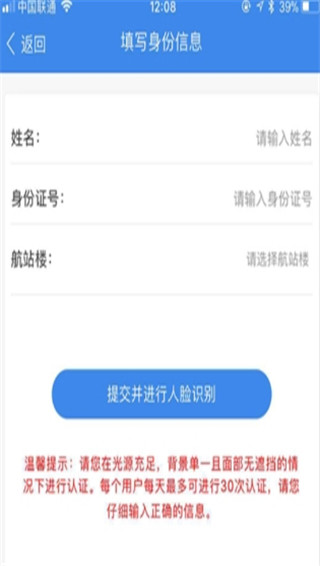 4、这时候会弹出个页面,让你填姓名、身份证号,还有航站楼信息。填好了就点“提交”,然后按照提示做个人脸识别认证。