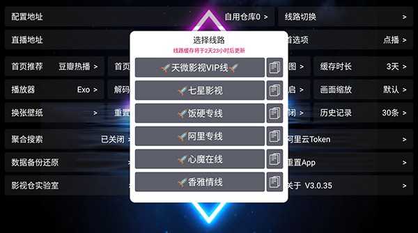 3、在设置页面里,你点一下“确定”,然后选“天微精选仓”,这样就能加载仓库里的线路了。这里面有好多厉害的线路,你想用哪个就用哪个,随便挑!