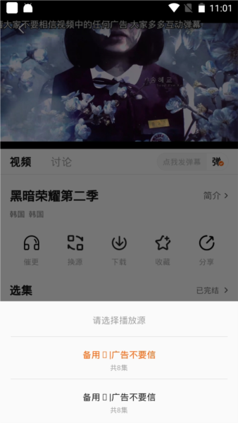 3、追剧的时候,还能点换源按钮来换视频源。这样,我们就能挑个画面清晰的,或者更新快的视频来播放啦。