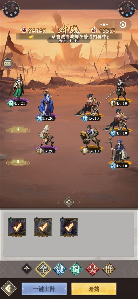 2、点击征战进入关卡选择武将,拖动武将可以移动位置