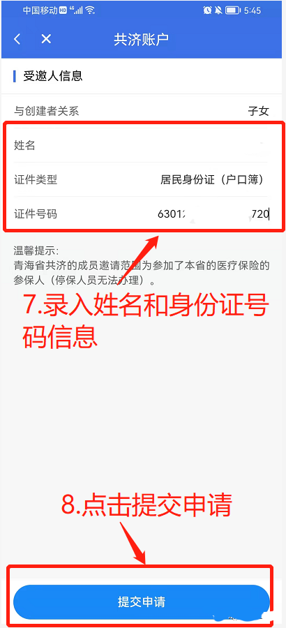 5、把受邀人的信息填好,填完点【提交信息】。之后按照提示完成人脸验证,验证完再点“账户划拨”。