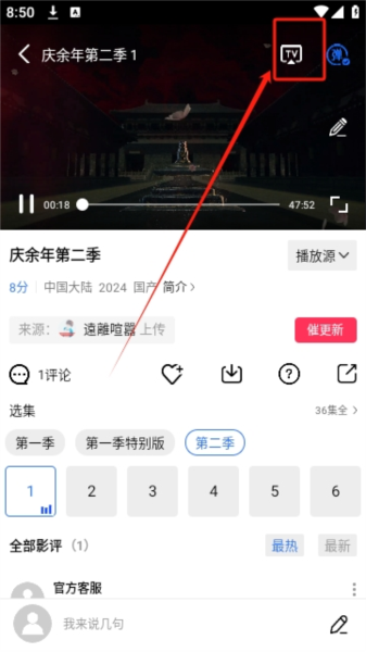 在播放界面里,你瞅瞅右上角,有个像电视一样的投屏标志,点它一下。
