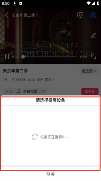 点了投屏标志后,会出现一些设备名字,你挑那个和你投屏设备名字一模一样的,点一下,然后等它连接成功,就能在大屏幕上接着看剧啦。