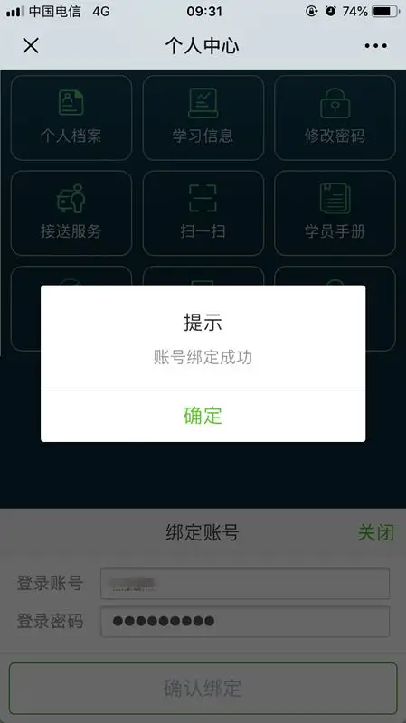 2、进入公众号后,找到“个人中心”,在那里绑定你自己的学习账号,就是你在学习平台上的那个个人账号。