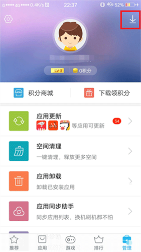 2、在管理中心提供应用更新、空间清理、应用卸载多个功能,再点击右下角