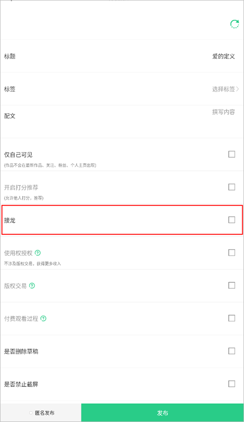 2、到了作品信息界面,把下面“接龙”那个选项勾上,再点“发布”,作品就上传成功咯!