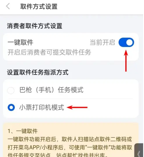 4、进入取件方式设置后,先把“一键取件”功能打开,然后选个小票打印机模式,弄好了就点“保存”。