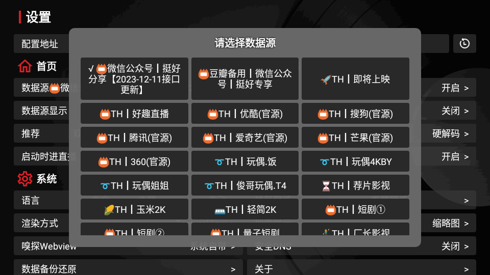 2、在设置菜单中选择【数据源】选项,系统将展示当前可用的多线路播放源列表。