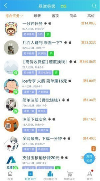 这款app是集注册下载,关注点赞,网页注册,砍价关注,认证绑卡,特单任务,长单任务,发贴转发,评论点赞,电商相关等综合任务赚钱软件,任务种类丰富多样,都是我们平时见到的各种类型,每个任务佣金从几毛到几十元不等,通常任务越复杂所需花费的时间比较长,任务的佣金奖励相对就比较多。小编建议大家以注册类任务为主,因为单价高,操作简单,赚钱*快!