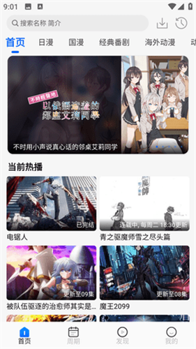 除此之外主界面设计非常简洁,像数码宝贝、灌篮高手、头文字D等一系列精彩的动漫作品。不仅如此还提供国漫、韩漫等一系列的频道划分,更有一键搜索功能可快速查询你喜欢的动漫作品,让你追番更轻松。
