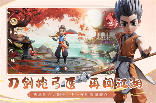 1、五大经典职业重出江湖,刀客勇猛、剑客飘逸、枪客威武、弓手精准、医师仁善,各展独特魅力。2、清新明亮Q版美术风格,融合卡通与武侠,全 PBR 工作流打造鲜活生动、如诗如画的武侠世界。