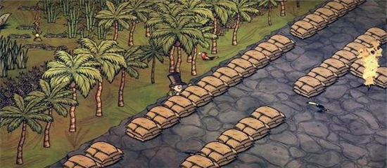 沙袋我基本上铺了一圈。左上方留了个口,方便坐船。铺这个是有必要的,风季来的时候,部分物质吹到水里会消失,吹走的东西会被沙袋挡住,不需要满地追。岩石墙和石灰石墙有些垃圾,遇到冰雹,就会塌方坏掉,沙袋则不会。