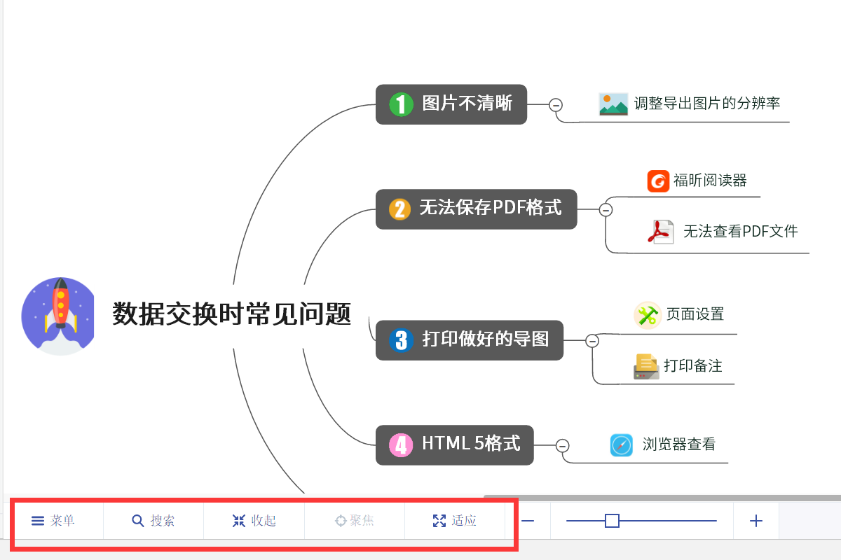 同时借助《收起》、《适应》按钮控制整张导图的显示区域,调整思维导图的大小。如果思维导图内容比较多的话还可以使用《搜索》功能进行关键词查找,内容都会突出显示。