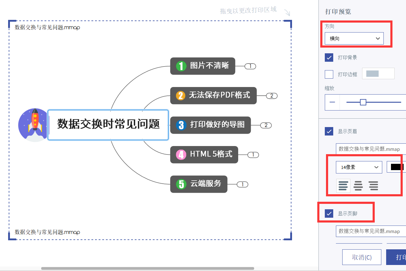 MindManager导出的HTML5格式,文件本身是矢量图,论文放到多大都不会失真。即使在没有源文件的情况下进行打印。你还可以设置是否显示页眉跟页脚。最后选取你要打印的区域即可。