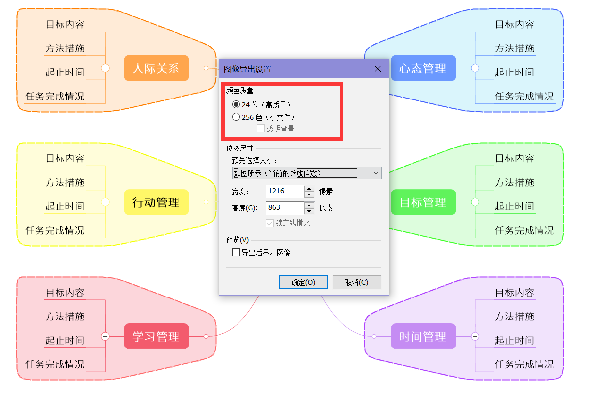如果是思维导图文件设置了透明度或是想要透明渐变效果,建议选择PNG格式。这个是从颜色质量的角度来解析。颜色质量因素对图片整体显示效果影响较小,不是造成图像模糊的主要原因。