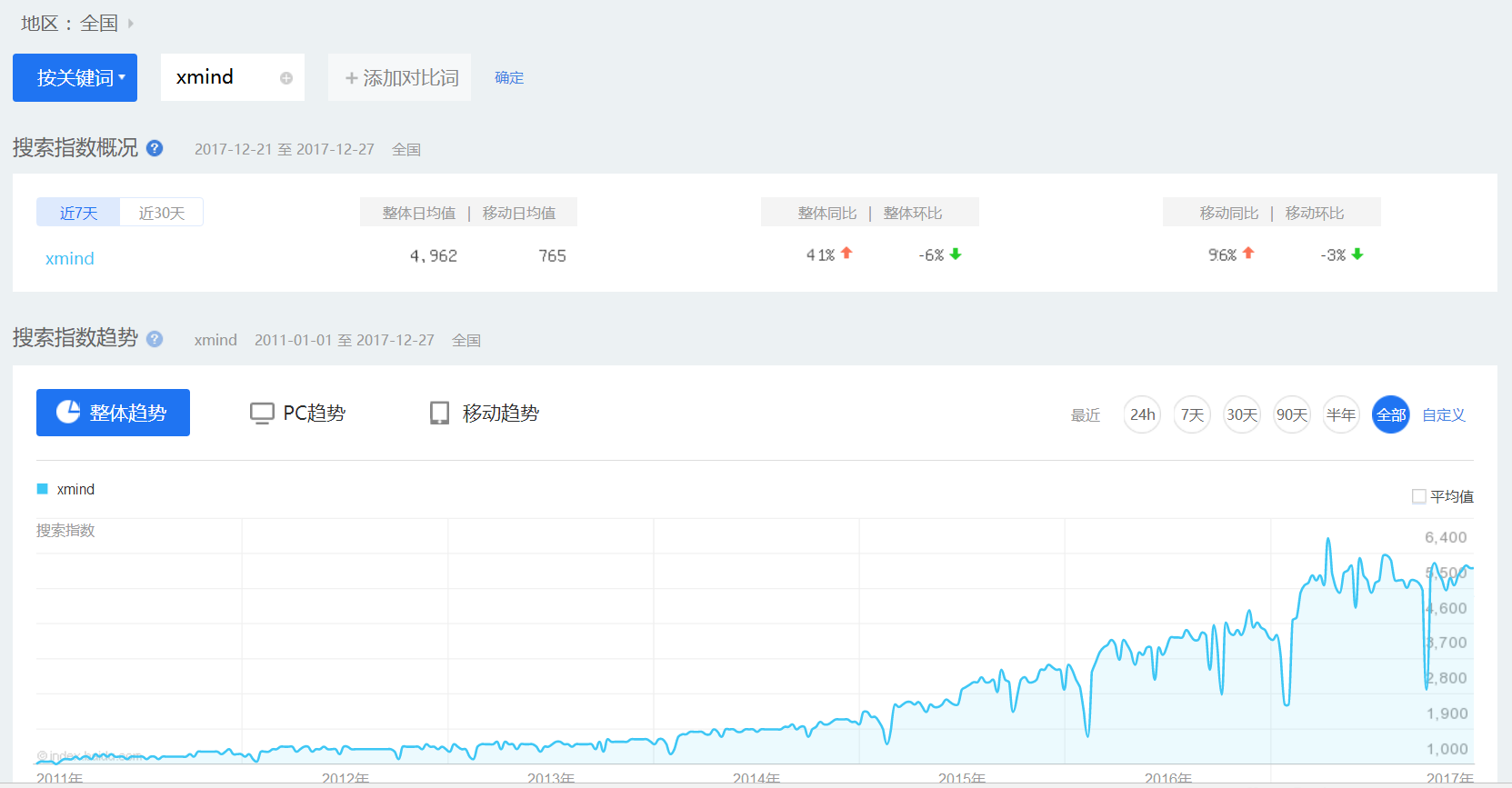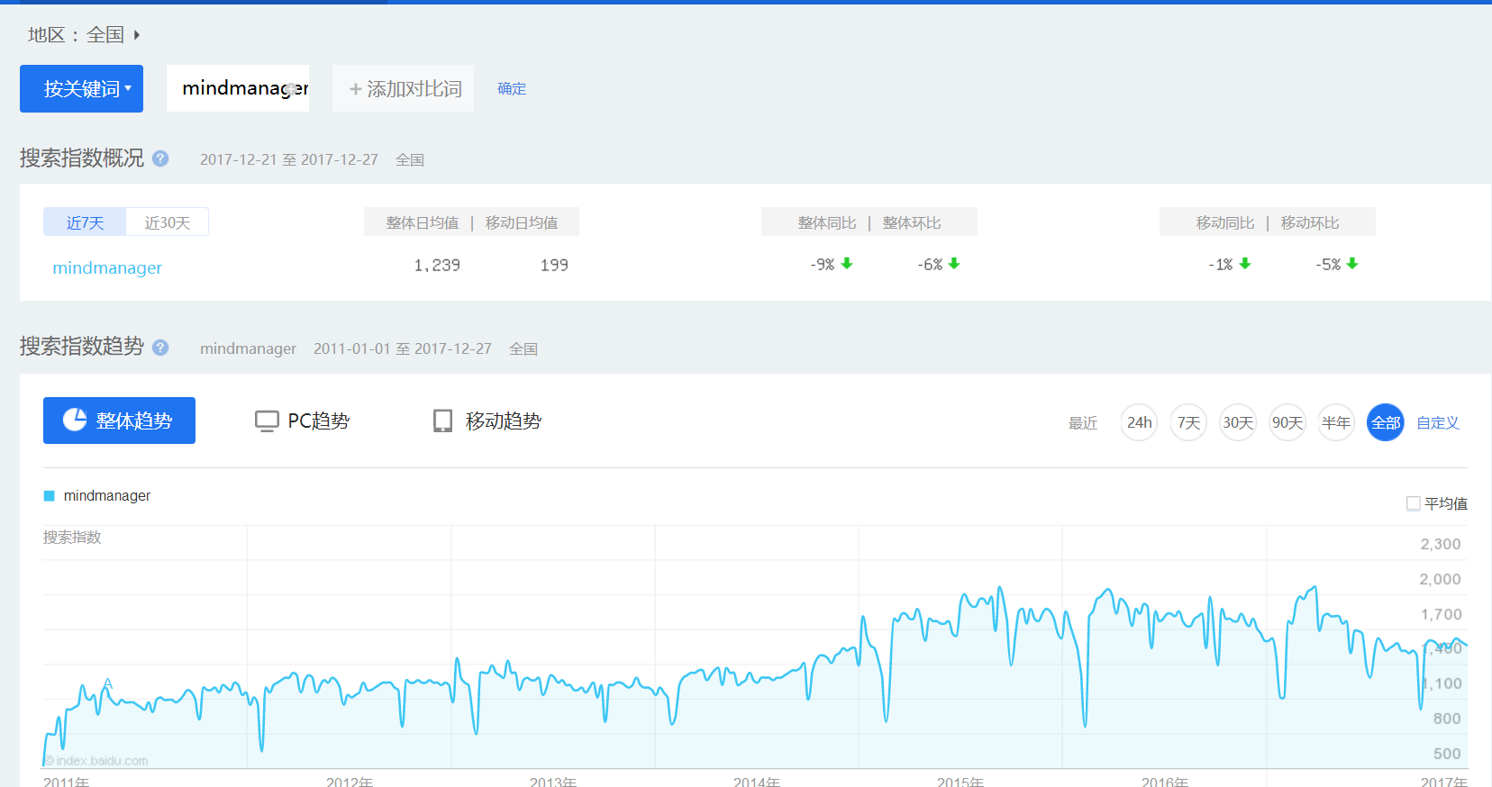 我们这里用数据来说话。看看大众对是选择都在用哪款导图软件。软件越流行,我们寻找素材或是模板资料也越容易。学习时间成本也少。所以这也是我们考察的点。现在这里用百度指数提供的数据。取样点是是2011年到2017年年底的数据。下图是两款软件的搜索指数。