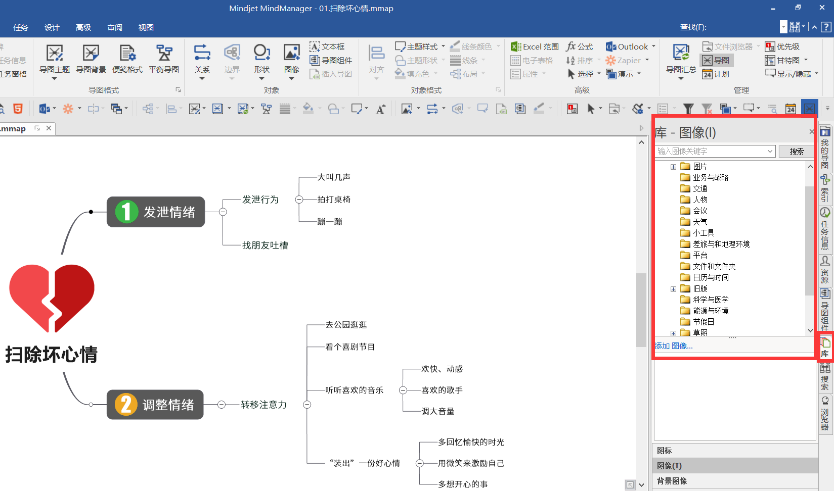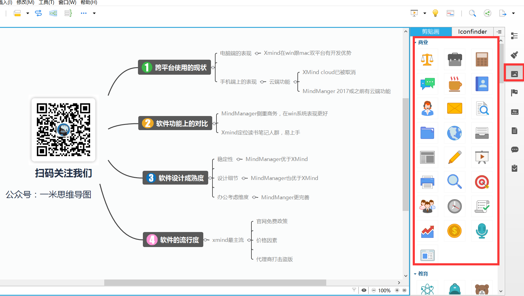 在软件设计细节上也优于。这里以一个常用的图片素材管理功能为例:也就是 pro版里的剪切画功能与MindManger图片资源。
